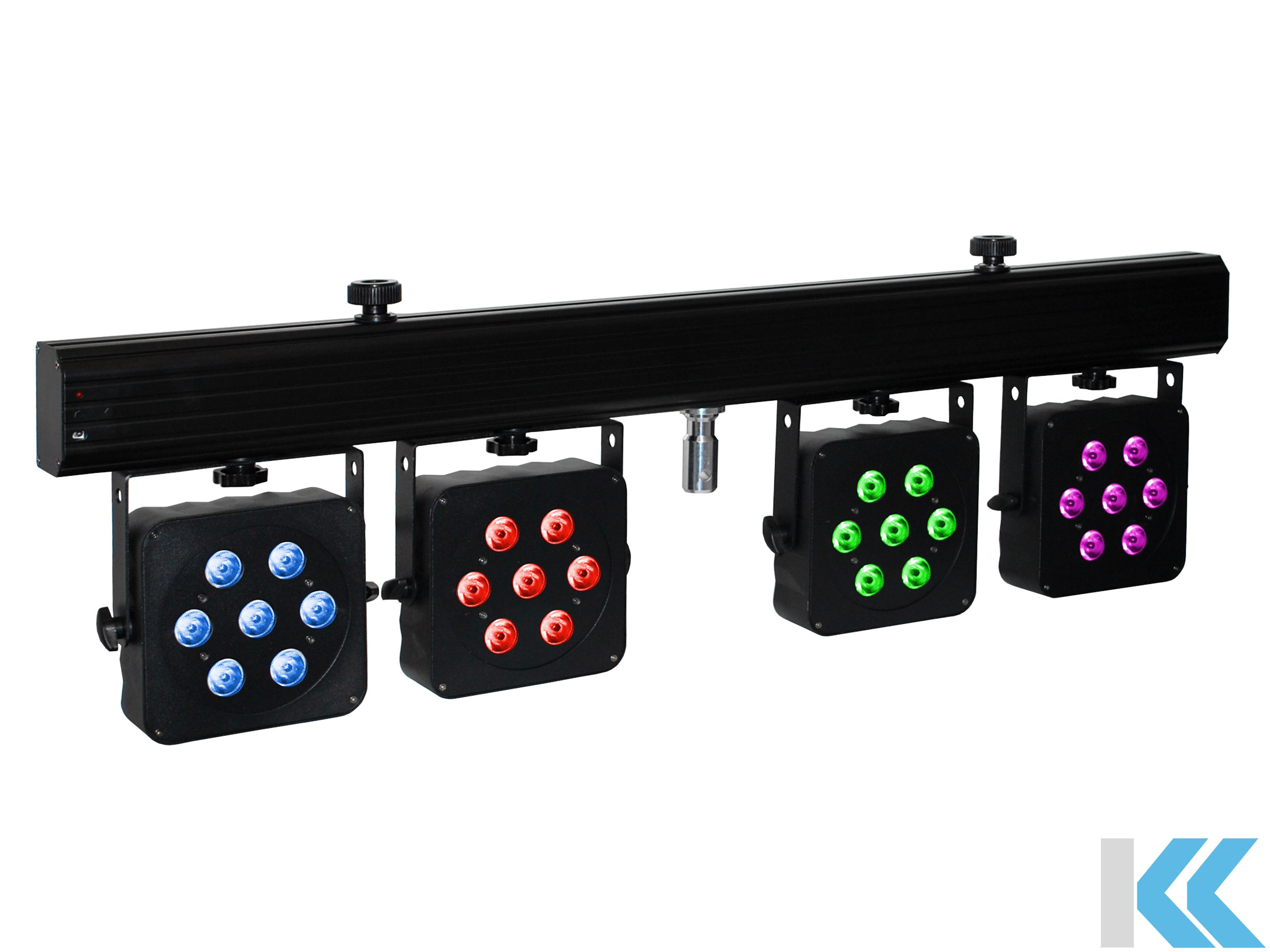 Die vier flachen PAR-Scheinwerfer mit je sieben ultrahellen 8W Quad-LEDs und 25° Abstrahlwinkel sind konvektionsgekühlt und individuell ausrichtbar an einem Träger mit integrierter Steuerung und allen Anschlüssen montiert. Zur Stromzufuhr und - weiterleitung dienen Neutrik Powercon-Buchsen, externe Komponenten können über zwei mit Fernbedienung schaltbare Schutzkontakt-Buchsen versorgt werden. Die Steuerung erfolgt über DMX, die mitgelieferte IR-Fernbedienung, ein optionales Fußpedal oder das übersichtliche, beleuchtete LC Display mit vier Funktionstasten.